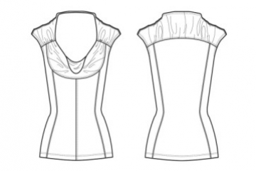 Body skimming tee with cap length sleeves, cowl neck and feminine seaming.